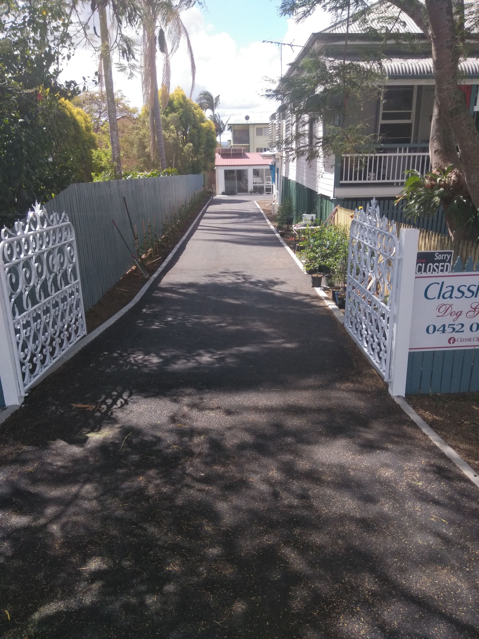 The owners of this Ipswich residence required a new driveway to be constructed between the fence and home and taken through to a new structure at the rear. The top layers of earth and old grass were excavated and removed from the site. The area was then levelled and given a fall to ensure adequate drainage of the finished surface. Concrete edging was then installed and left to cure. Once the edging was completed, we then brought in a cement-treated road base. This was spread out between the edging and compacted.